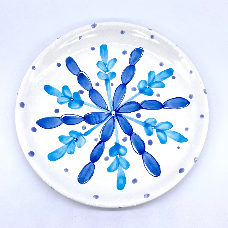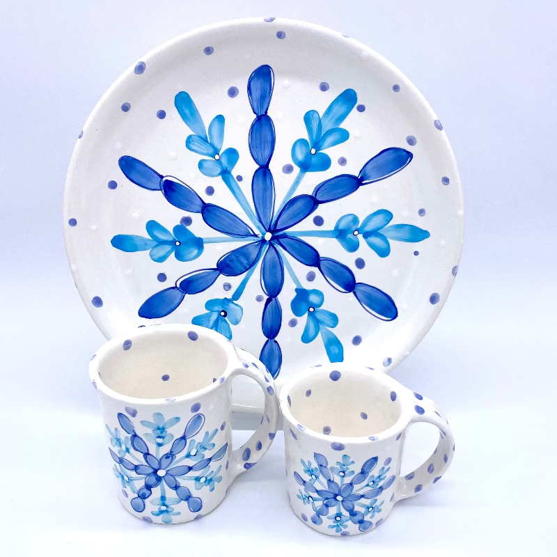 This year's Limited Edition Holiday Plate features a bright blue snowflake with soft blue and white polka dots swirling around in the background. Whimsical and festive, this pattern is not only perfect for the holidays, but all winter long!