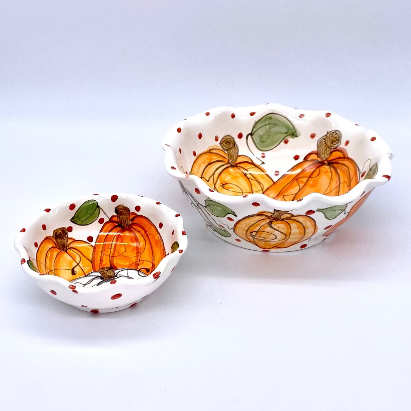 Classic Fall…this pretty pattern features multi colored pumpkins, a sweet polka dot background, and a delicate fluted edge. Easily mix and match all season with your Halloween and Thanksgiving decor, and as always makes a wonderful gift for someone you adore!