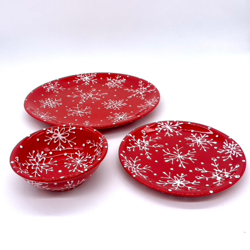 Our Entertainer Bundle features one 12-inch plate, one 8-inch plate, and one dessert bowl from the Red and White Snowflake Collection.