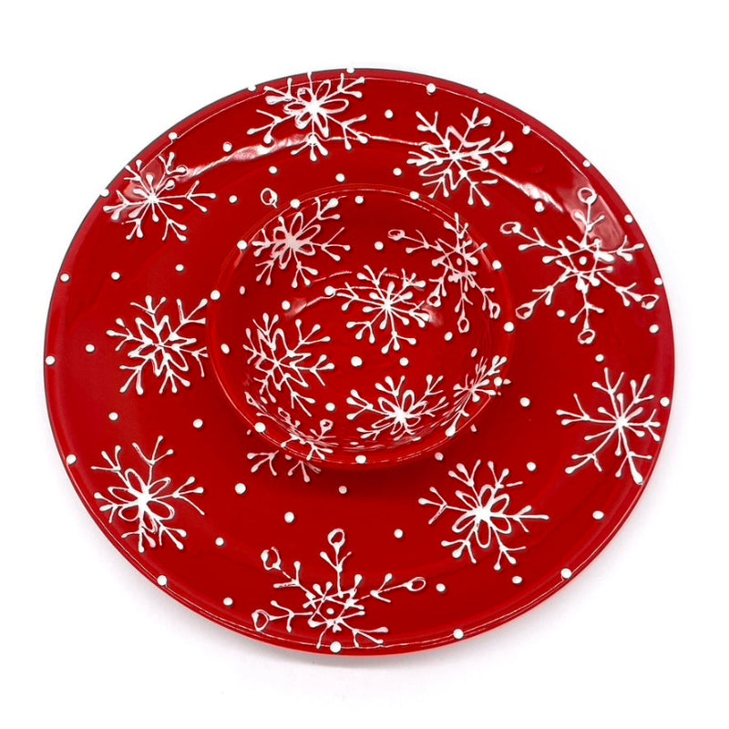 Our Serving Bundle features one 12-inch plate and one dessert bowl from the Red and White Snowflake Collection. This dynamic duo is perfect for dips, chips & salsa, and other appetizers.