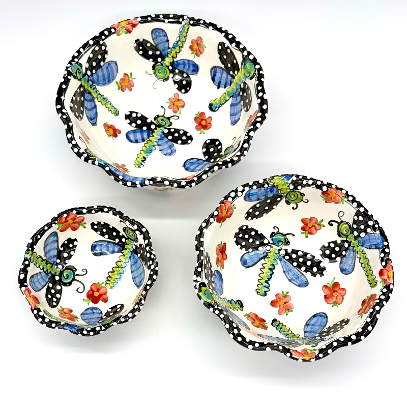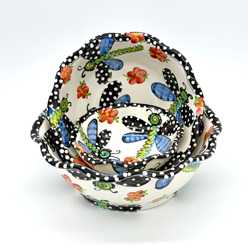 Multicolored dragonflies and quaint flowers are accented with a charcoal black edging in this whimsical pattern. ...