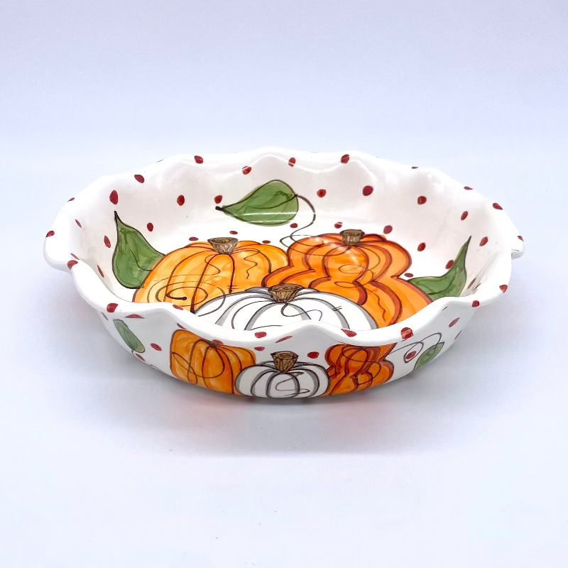 Classic Fall…this pretty pattern features multi colored pumpkins, a sweet polka dot background, and a delicate fluted edge. Easily mix and match all season with your Halloween and Thanksgiving decor, and as always makes a wonderful gift for someone you adore!